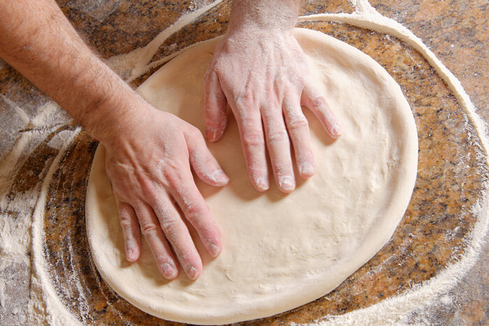 La stesura della pizza è una fase essenziale per la buona riuscita del prodotto finale. Il passaggio in forno deve avvenire quando il panetto è sufficientemente rilassato e lievitato. Lo capiamo perchè si fa stendere senza opporre resistenza evitando, quindi, l’effetto molla.